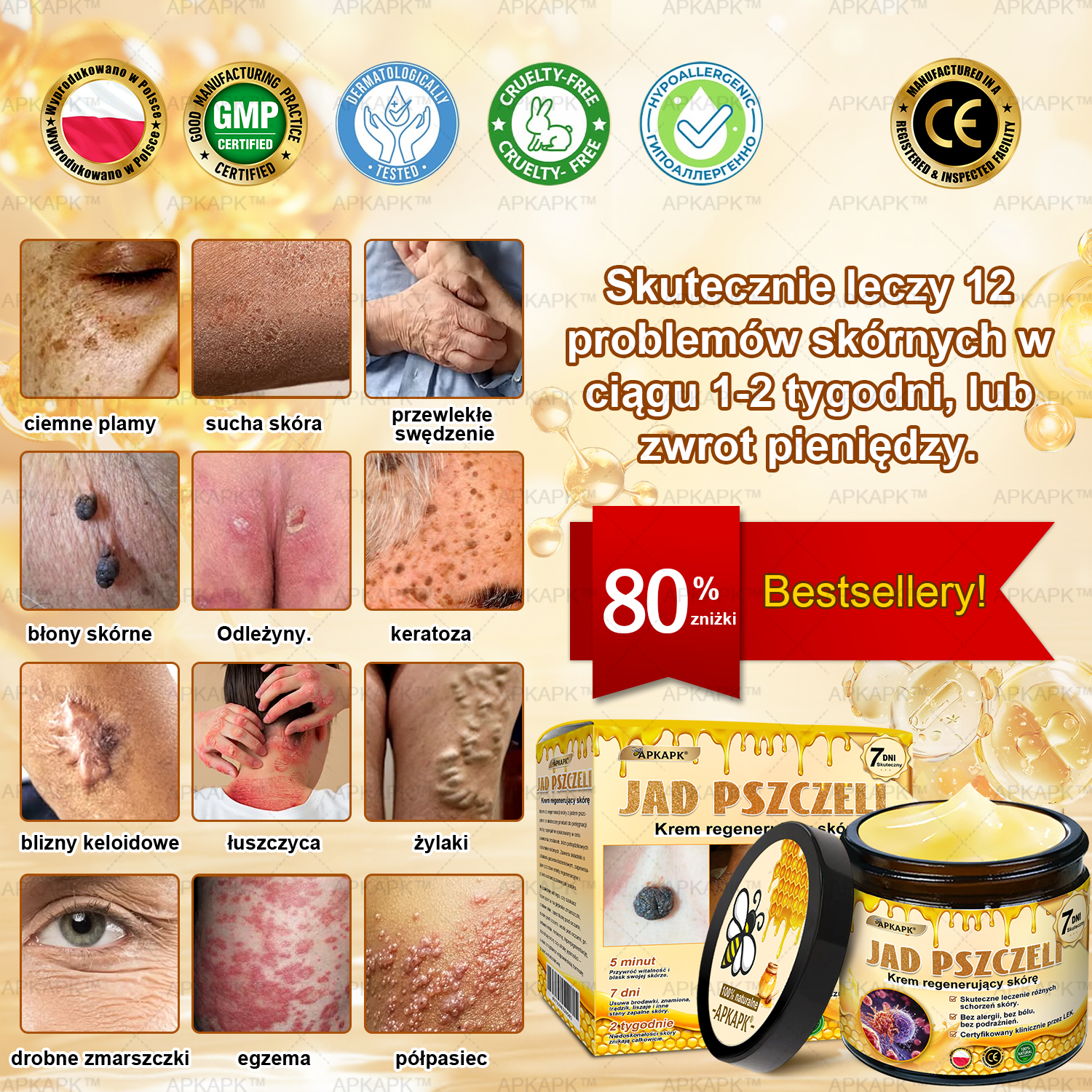 Klinicznie testowany przez polskich dermatologów, krem regenerujący skórę z jadem pszczelim 𝐀𝐏𝐊𝐀𝐏𝐊® może już w ciągu 7 dni pomóc zmniejszyć suchość, stany zapalne, swędzenie oraz widoczne oznaki starzenia się skóry.